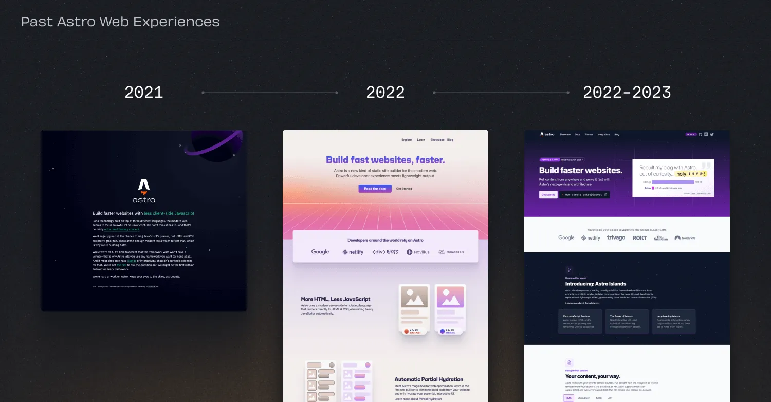 Over the last three years we’ve been through several iterations of our website and visual style. Our first website was just a single-page manifesto of the Astro vision and a hidden console.log easter egg to join a secret early-access Discord.